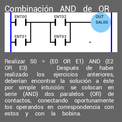 Después de haber realizado los ejercicios anteriores, deberían encontrar la solución a éste por simple intuición: se colocan en serie (AND) dos paralelos (OR) de contactos, conectando oportunamente los operandos en correspondencia con estos y con la bobina.
